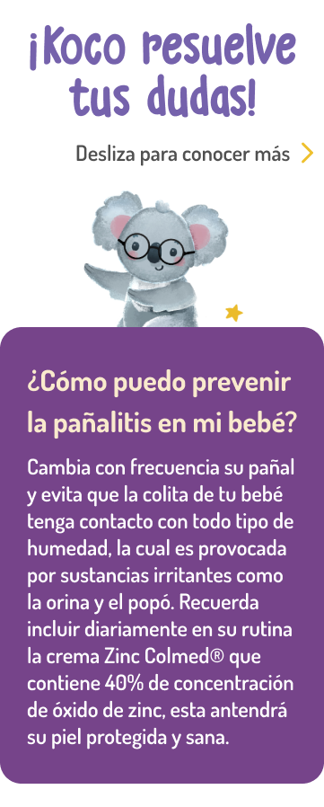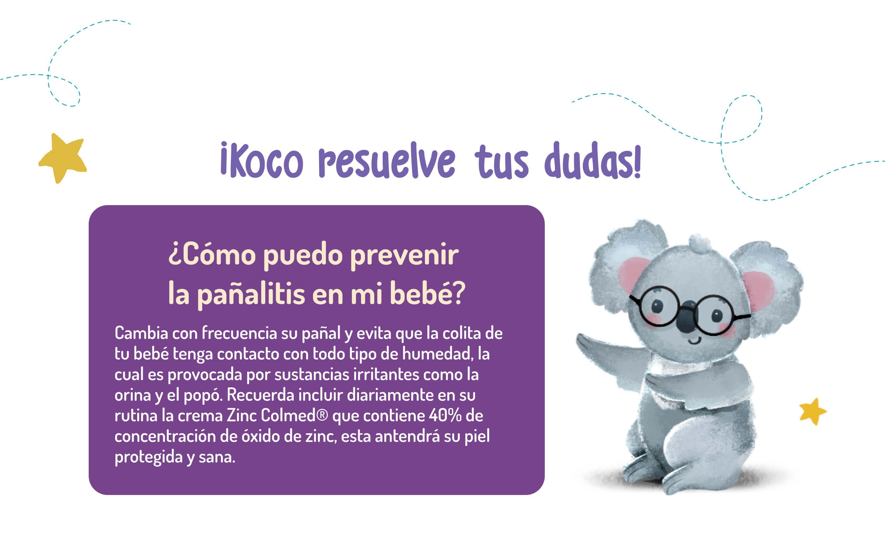 Aquella que contenga óxido de Zinc como principal activo, puedes elegir la mejor opción verificando su porcentaje de concentración en este compuesto, entre mayor sea mucho mejor. La crema Zinc Colmed contiene una concentración del 40% y mayor absorción, por eso actuará como capa protectora y preservará la humectación natural en la colita de tu bebé con mayor eficacia.